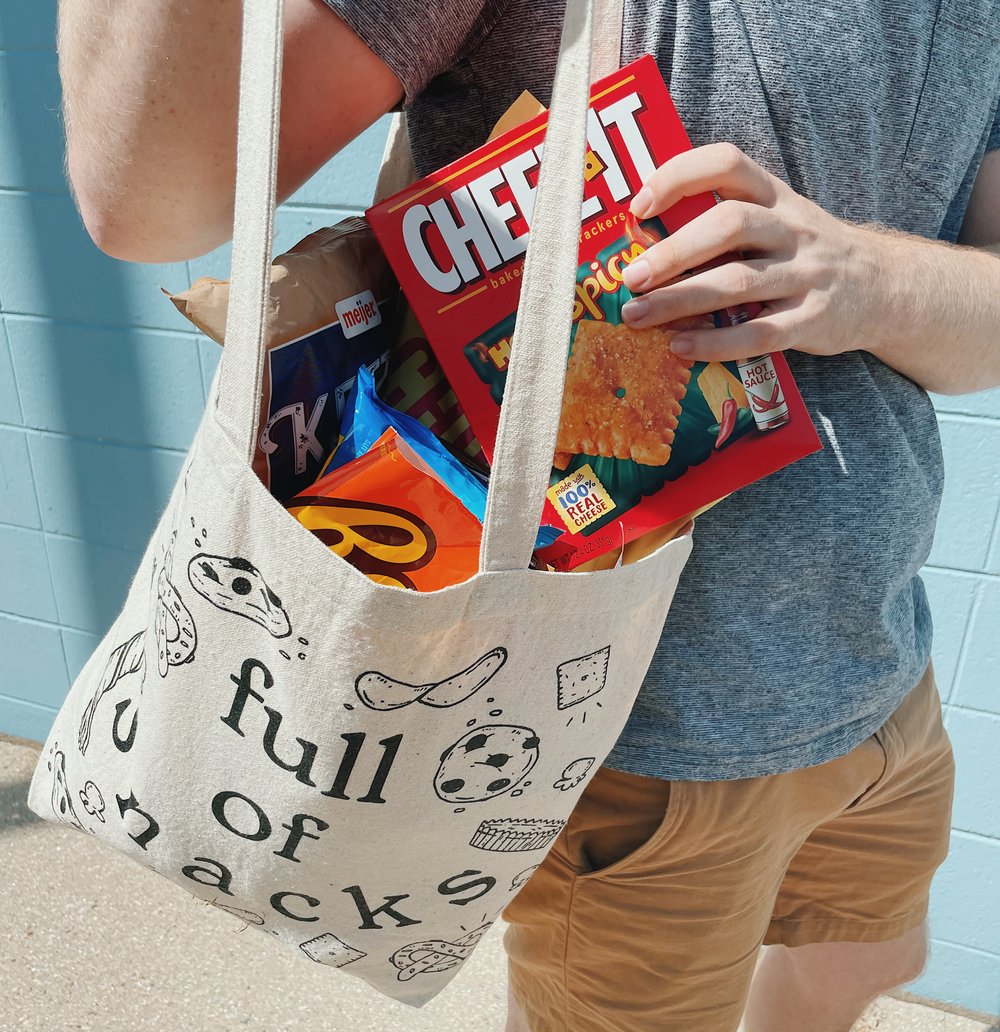 100% cotton canvas tote bag made for filling up on snacks, going grocery shopping, a day at the beach, or whatever!